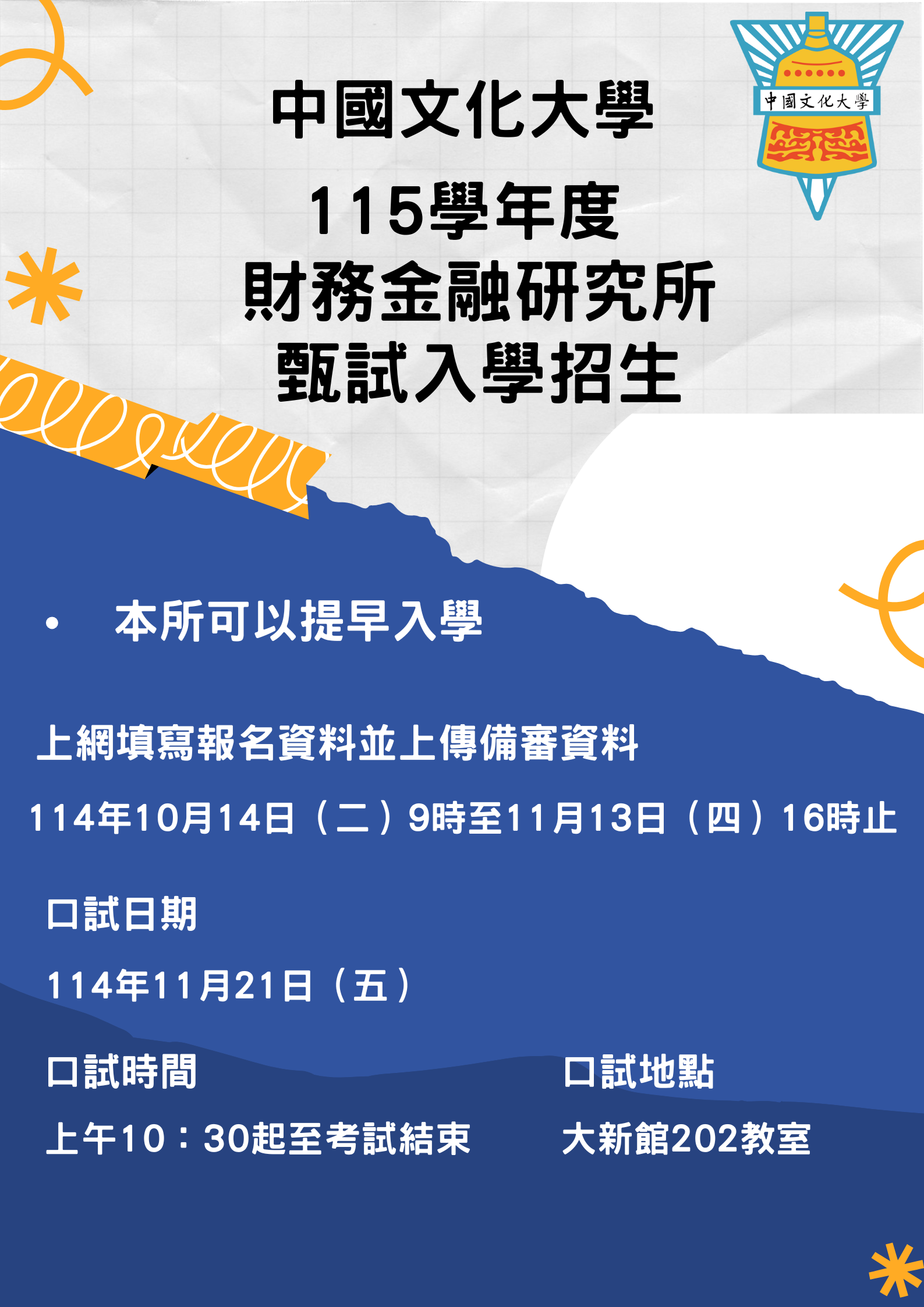 (1)網路報名及上傳備審資料日期:114年10月14日(二)上午9時起至11月13日(四)下午4時止。