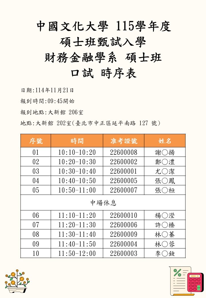 115學年度文化大學財務金融學系碩士班甄試入學口試序